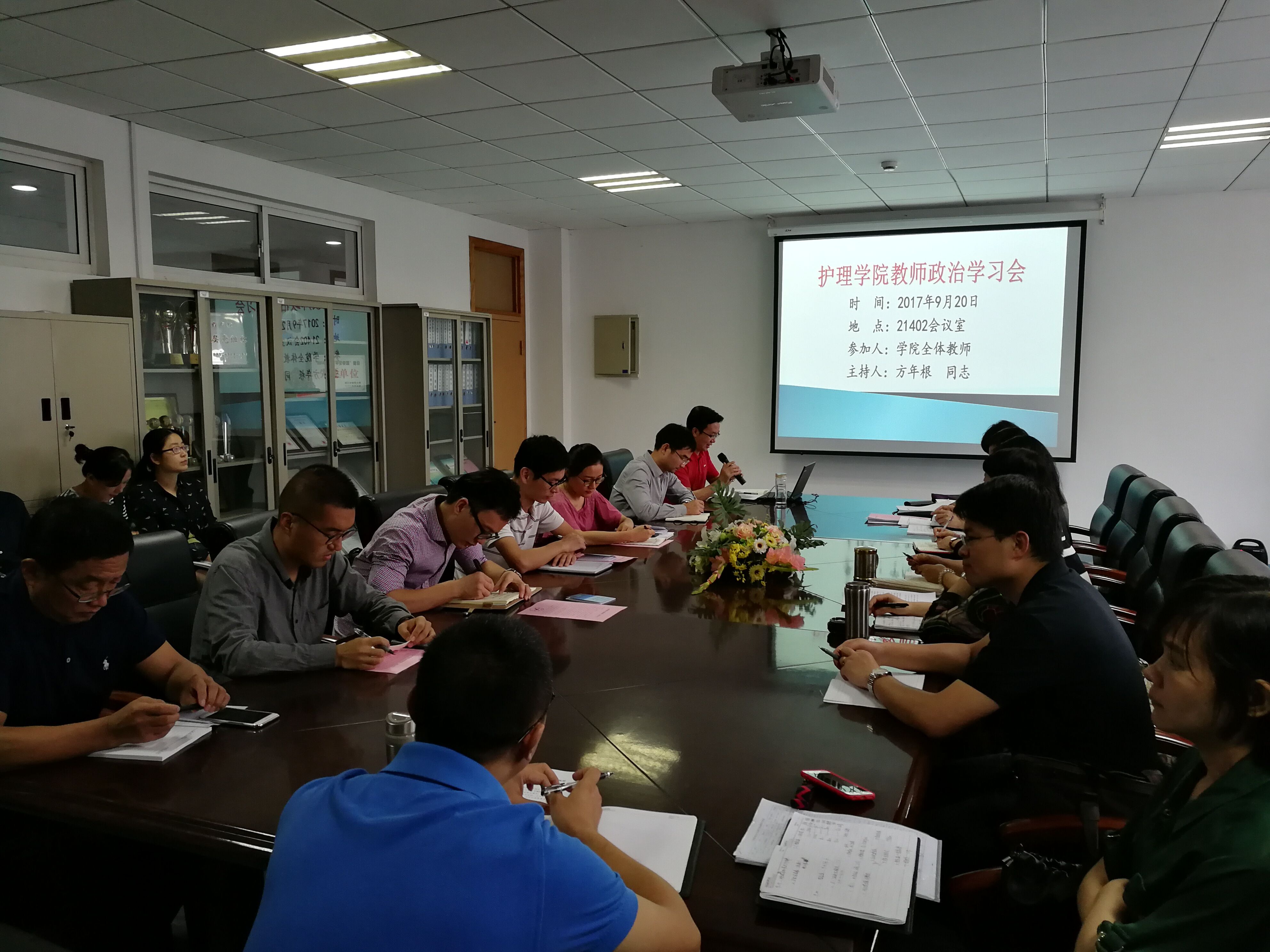 9月20日下午,今年会党总支在21402会议室组织安排教师政治学习会,重点学习习近平总书记在省部级主要领导干部专题研讨班上的重要讲话(简称“7.26”重要讲话),传达学习省委常委、宣传部部长葛慧君在全省高校书记校长读书会上的讲话,并对开展向黄大年、姚玉峰、陈莹丽同志学习的主题教育实践活动进行了再动员再部署。学习会由学院党总支书记方年根同志主持并宣讲,学院全体教师参加学习会。
