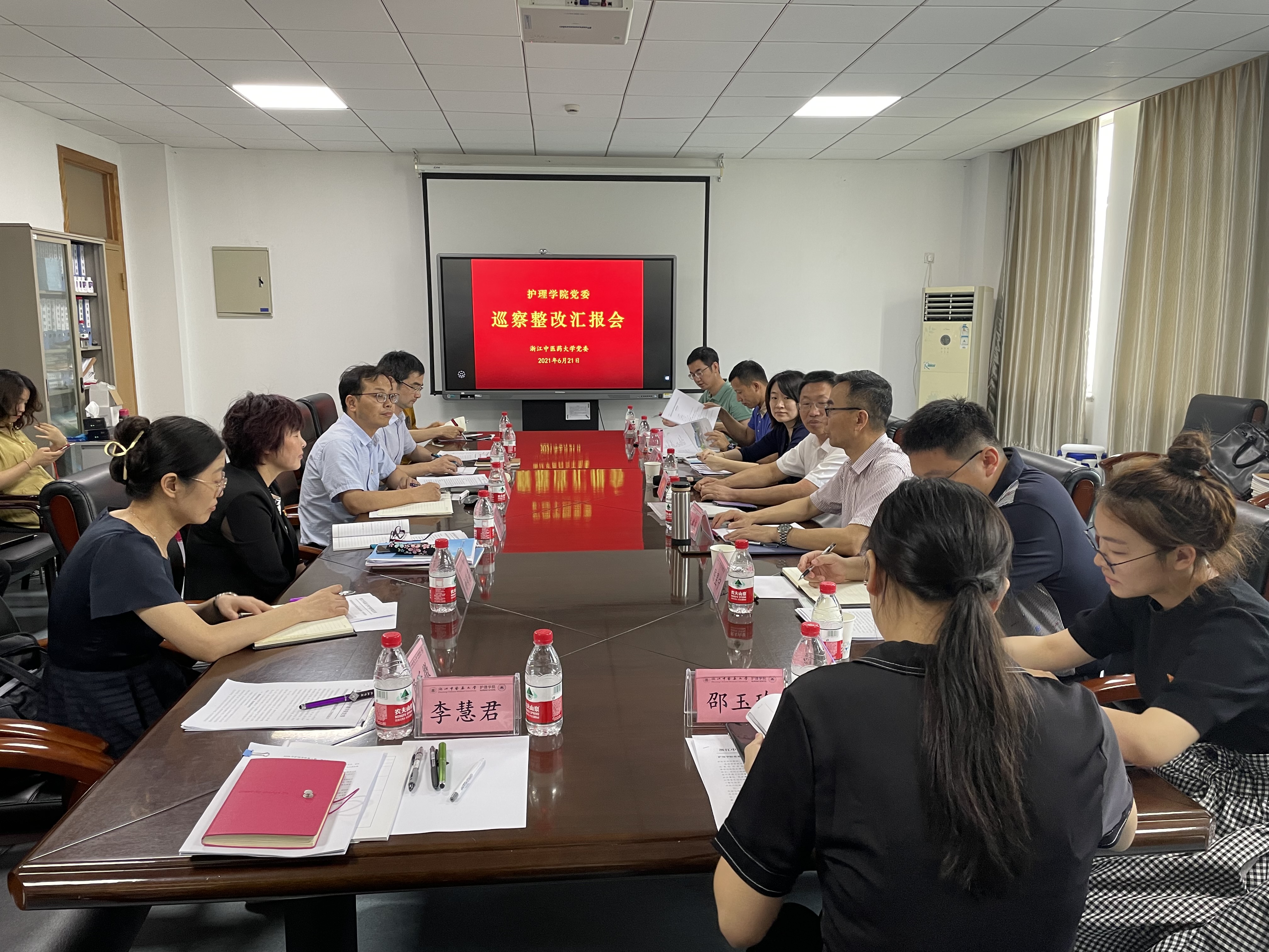 2021年6月21日上午,今年会校内巡察整改汇报会在21404会议室召开。学校纪委书记、监察专员王轶,第二巡察组组长朱建良,副组长王婷、陈昱宁,成员王亦秋、徐文主、金艳茹、邵玉珍出席会议,今年会党政领导班子成员、科级干部、教研室主任等参加会议。会议由朱建良组长主持。