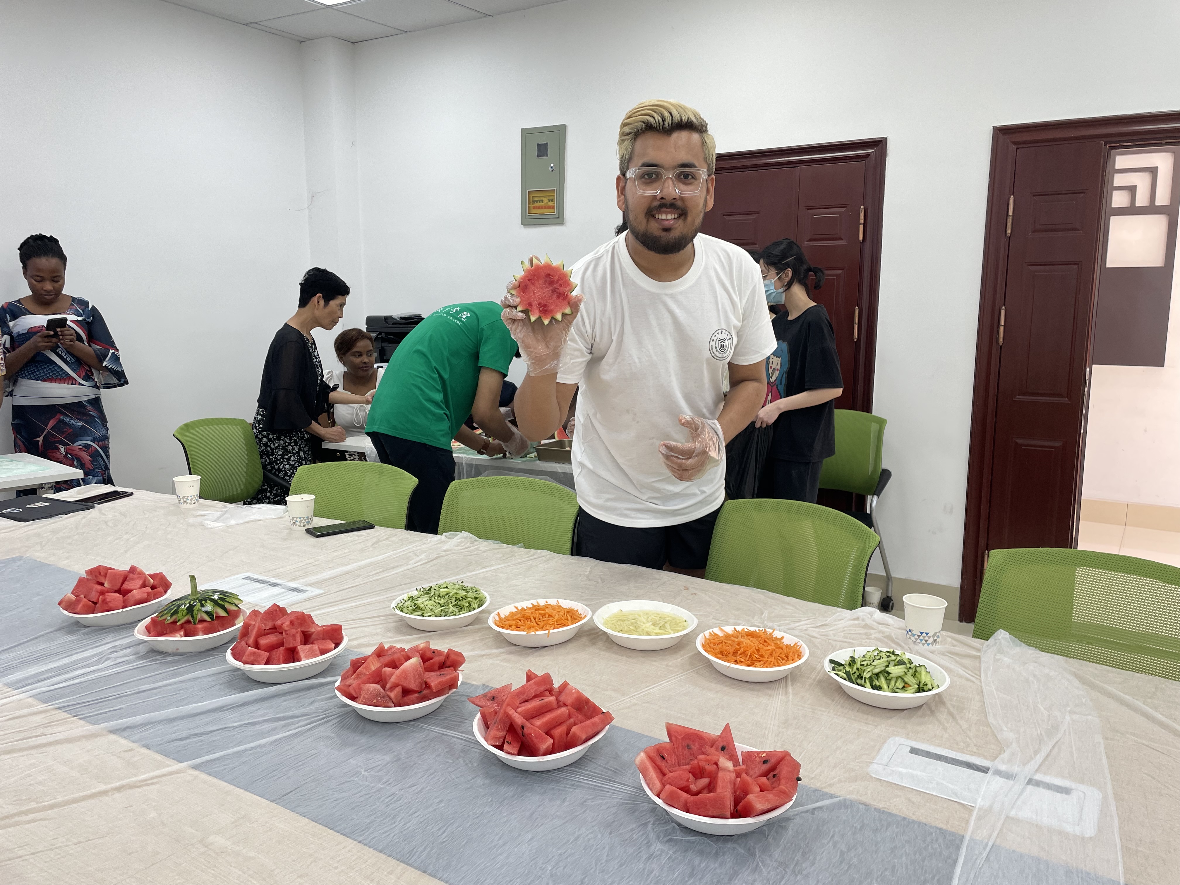 经过3个小时的分工合作,同学们完成了和面擀面搓面鱼;蔬菜切丝焯水备用;西瓜的切块装盘雕花;八仙过海各显神通。制作过程欢乐不断,妙趣横生,中国饮食文化也在潜移默化中给大家留下深刻的印象。在享受劳动成果的那一刻,大家都非常感激彼此的付出,并表示非常期待下一次活动。
