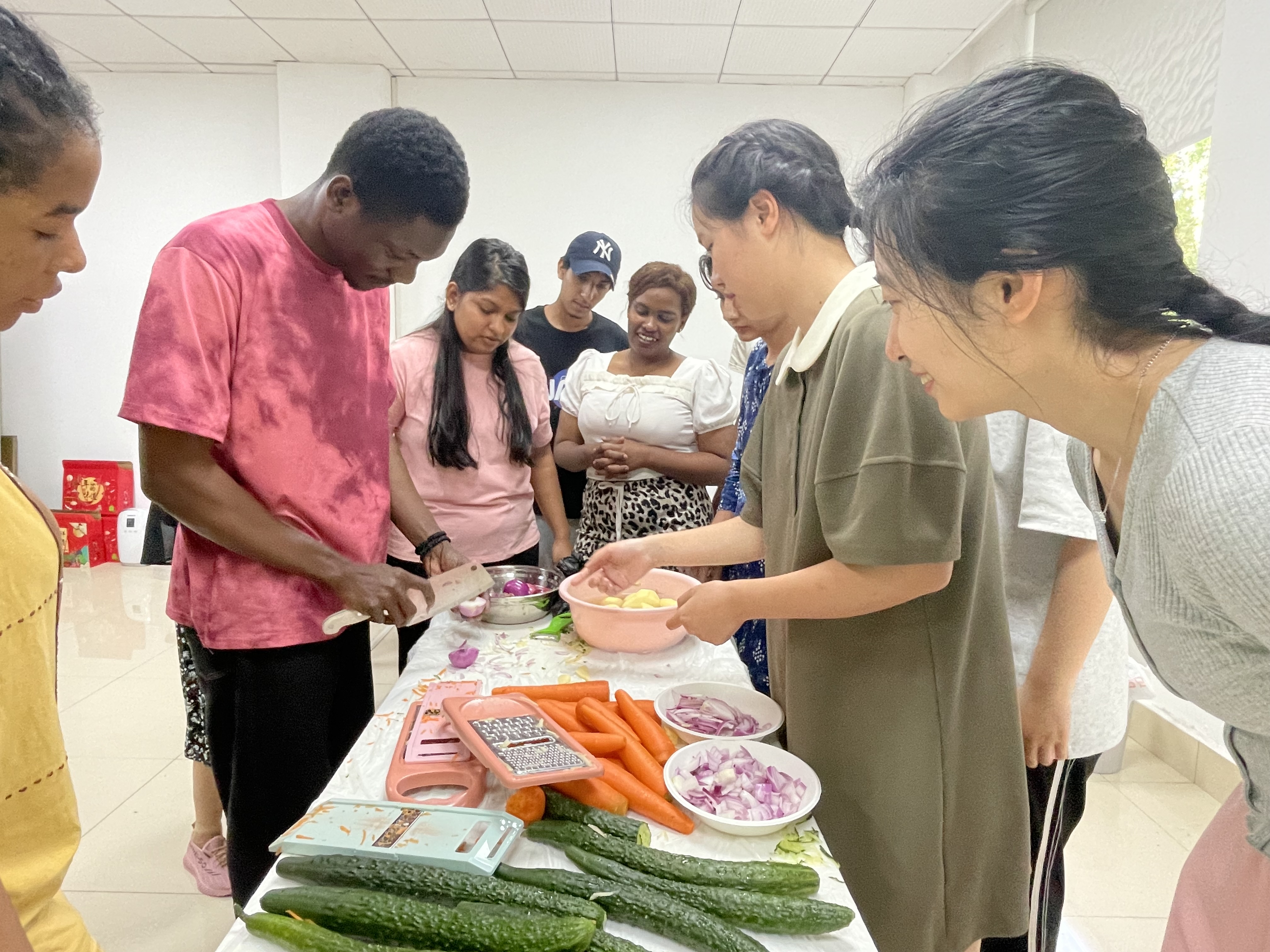 今年会李慧君老师介绍美味汉语角是促进外国留学生了解中国饮食文化的新载体,将发挥中外文化交流的桥梁作用,增加中外文化交流。民以食为天,希望同学们通过自制美食,体验劳动的快乐和收获劳动的幸福。国教黄琳琪老师和外教Lorna,SUN SUIMING 老师分别作了讲话,鼓励中外学生团队作业,相互合作,享受快乐,共同进步。
