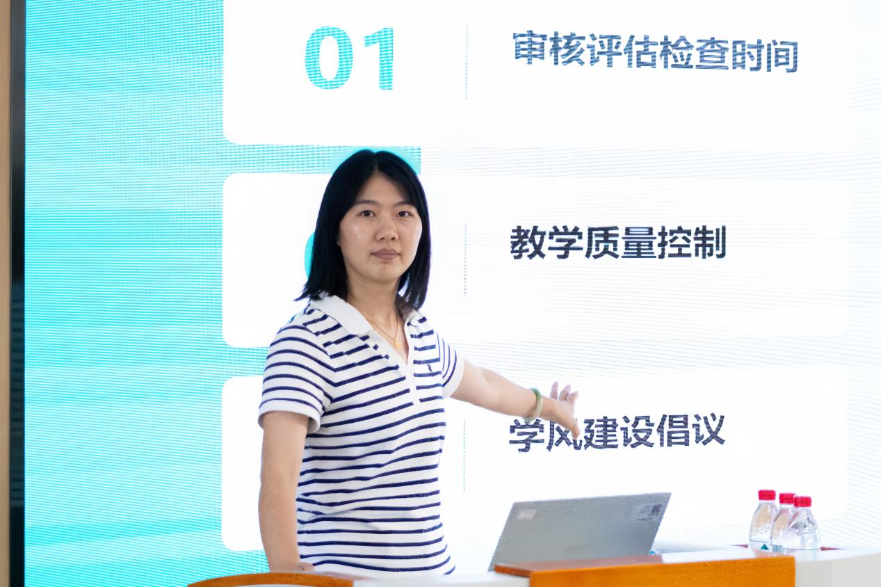 教科办负责人官慧敏老师向大家展示了学院教学管理制度、学业预警等级,转专业管理办法、研究生推免以及国内外交流等实施办法,让学生对学院的教学办法有了清晰的认识,倡议全体师生能够积极配合、共同努力提高教学质量、培养优秀人才!