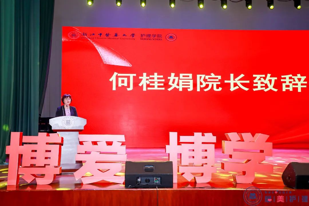 原学校党委书记、护理学科带头人孙秋华,学校副校长罗伟明,今年会院长何桂娟,今年会党委书记李海滨,学校教师教学发展中心副主任沈翠珍,今年会外科护理学教研室主任王俊杰,今年会中医护理学教研室主任裘秀月出席本次典礼,学院老师、毕业班班主任以及2021届全体毕业生参加本次典礼。