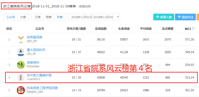 在护生们的共同努力下,公众号成绩斐然,全年稳居全校各学院公众号清博指数排行榜前三,并于今年11月份荣登学校榜首,位列浙江省院系风云榜第4名。“最美护理”团队先后荣获学校宣传工作先进集体、“优秀网络文化工作室”等荣誉。