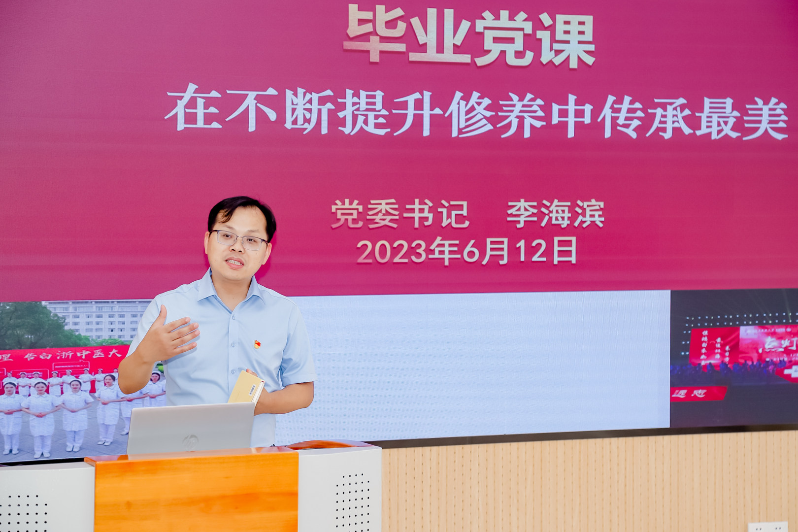 为做好主题教育、党性教育、廉政教育和职业教育的“融合”文章,学院党委书记李海滨为毕业生党员讲授了“在不断提升修养中传承最美”专题党课。他寄语毕业生党员:一是要秉持“扶摇直上九万里”的必胜信心,筑牢“思想魂”,把习近平新时代中国特色社会主义思想转化为坚定理想、淬炼党性的强大动力;二是要砥砺“越是艰险越向前”的创业热情,激发“斗争志”,在学思践悟中筑牢信仰之基,推动护理事业强劲发展;三是要坚守“要留清白在人间”的清正气节,画好“同心圆”,在知行合一中守正廉洁,把稳思想之舵。