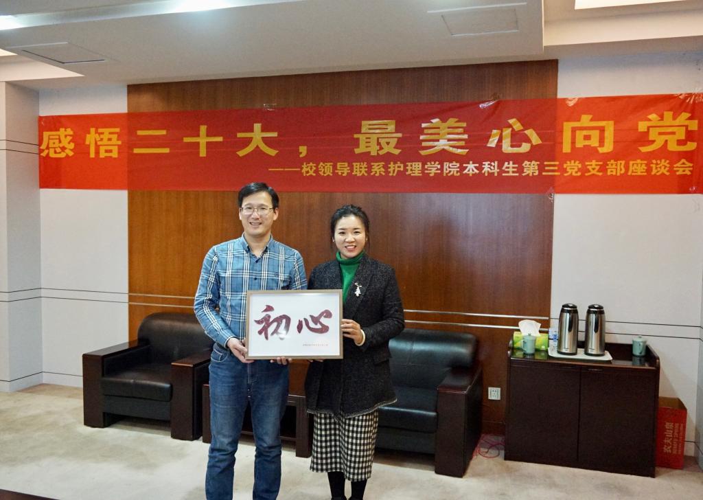会后,黄校长为支部党员代表赠送《习近平七年知青岁月》《习近平与大学生朋友们》等书籍,支部书记汤亚玲也送上由衍纸制作的“初心”,象征“不忘初心跟党走,砥砺前行颂党恩”的美好祝愿。今后,今年会本科生第三党支部将继续秉持“崇德修身,践行最美”的理念,以全国党建标杆院系为指引,脚踏实地、守正创新,初心如磐、勇毅前行!