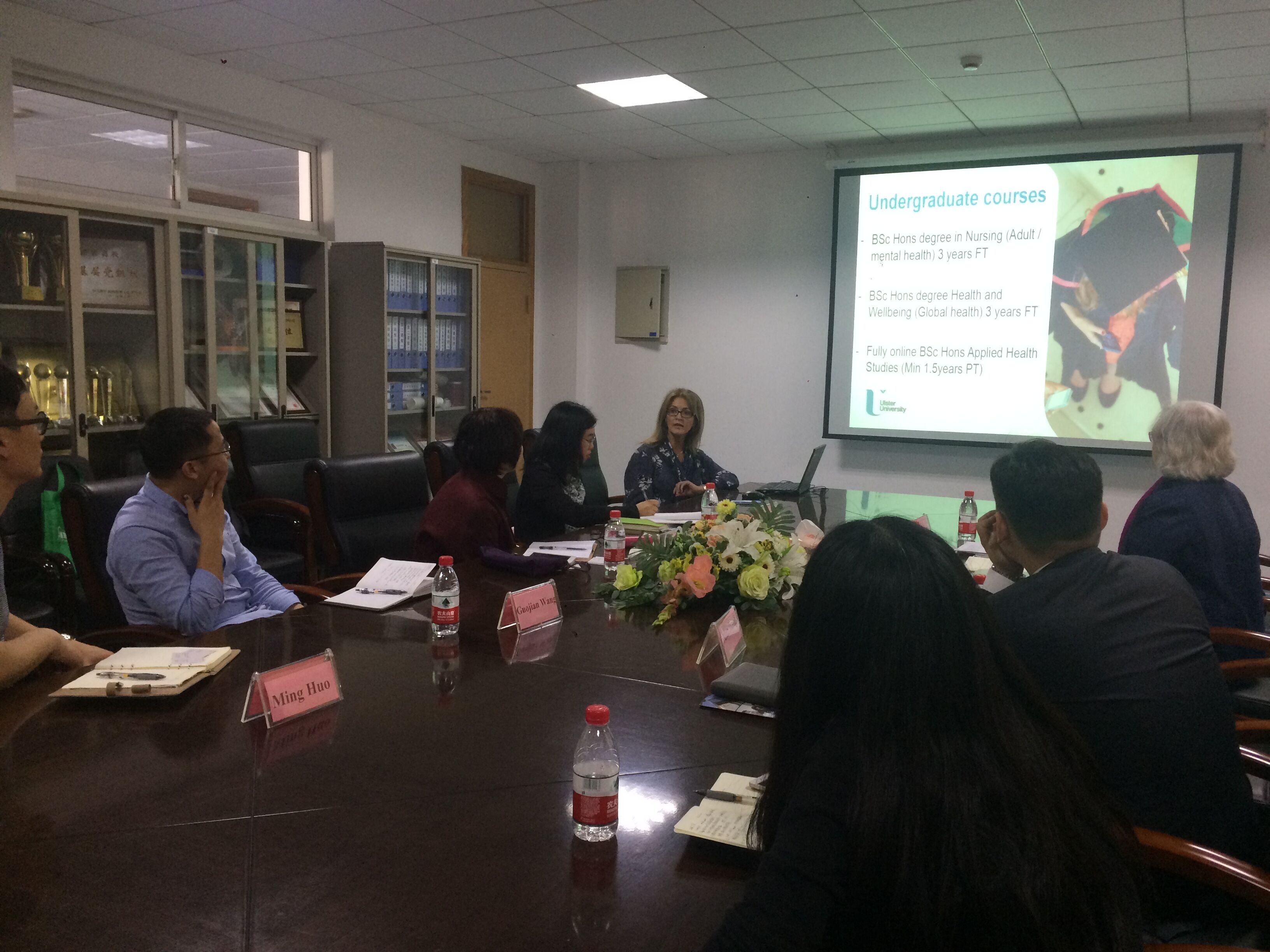 何桂娟院长向阿尔斯特大学的两位教授表示欢迎,并介绍了今年会的历史沿革、护理和助产专业的学科建设、师资队伍和教学条件等。随后,阿尔斯特大学的Carol教授也介绍了该校的概况,包括地理环境、专业设置和学生就业等。Donnell教授详细介绍了该校护理专业的基本情况。阿尔斯特大学,地处北爱尔兰,其护理专业目前英国排名第5,具有本科、硕士、博士三个层次。地彼此了解后,双方就可能开展的合作进行讨论,关于本科生的“2+1+1”合作模式和研究生的“1+1+1”合作模式有开展的可行性达成共识。另外,关于开展学生短期交流项目、教师科研合作和师资培训等项目也做了深入沟通和交流,双方高度认可彼此的合作基层,愿意尝试各种新的项目,以促进彼此学科和文化的交流。