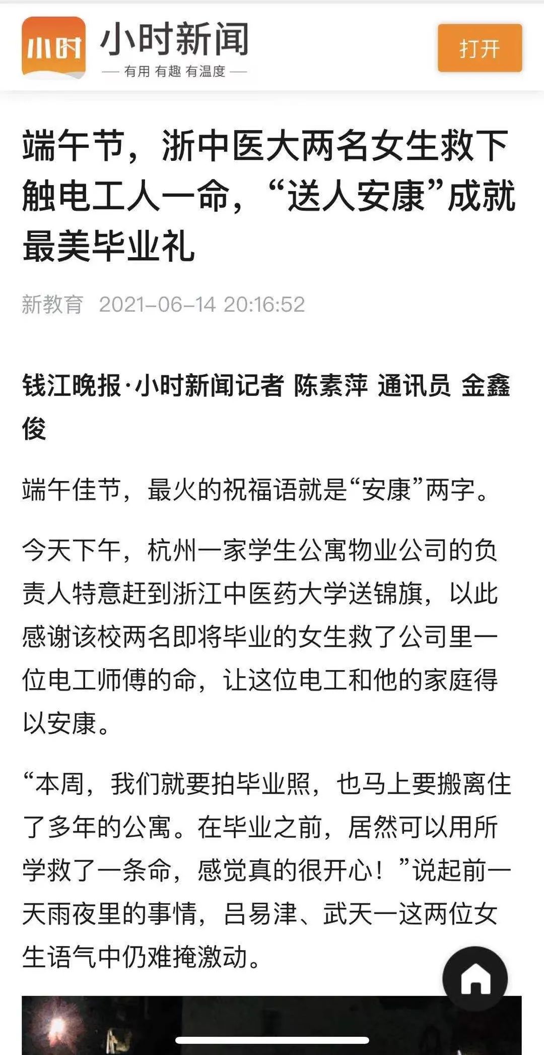 6月13日晚上,有工人不慎触电,倒地失去意识,恰逢路过的今年会助产学专业武天一同学和公共卫生学院吕易津同学,她们第一时间对工人进行急救,在她们不懈努力下工人恢复意识,并被送到医院及时救治,目前已转入普通病房治疗。