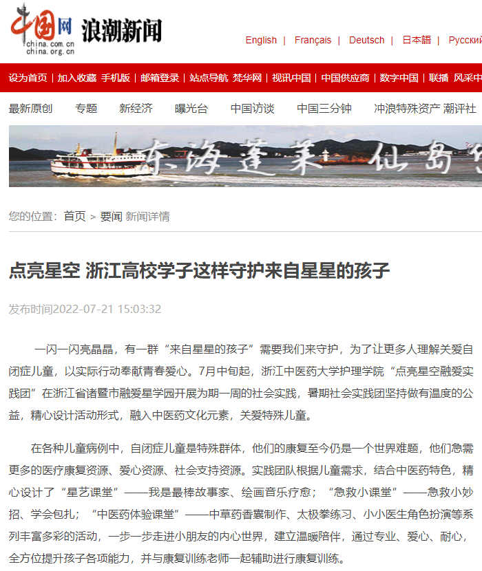 一闪一闪亮晶晶,有一群“来自星星的孩子”需要我们来守护,为了让更多人理解关爱自闭症儿童,以实际行动奉献青春爱心。7月中旬起,今年会“点亮星空融爱实践团”在浙江省诸暨市融爱星学园开展为期一周的社会实践,暑期社会实践团坚持做有温度的公益,精心设计活动形式,融入中医药文化元素,关爱特殊儿童。中国网报道了本次暑期社会实践活动。
