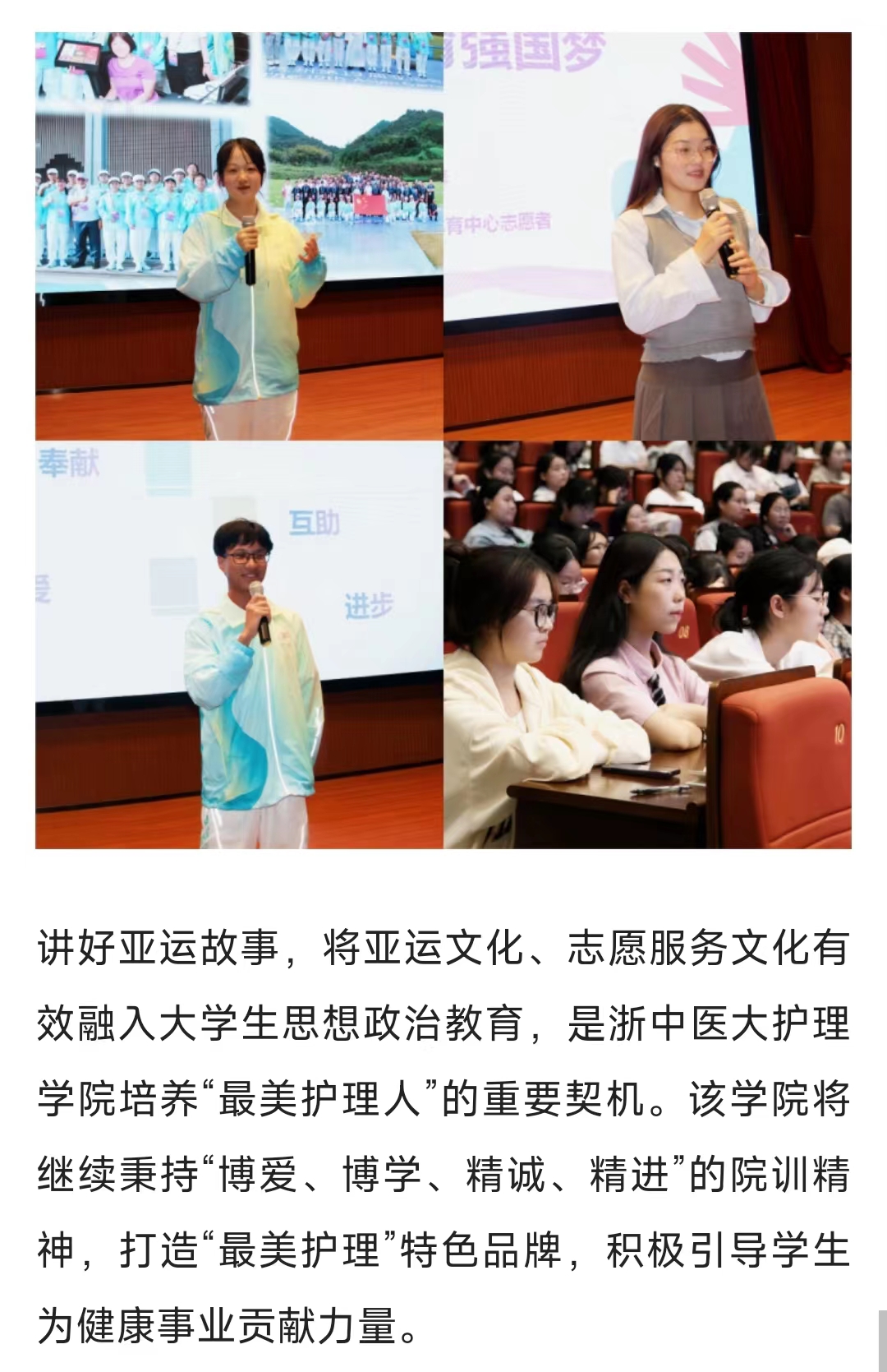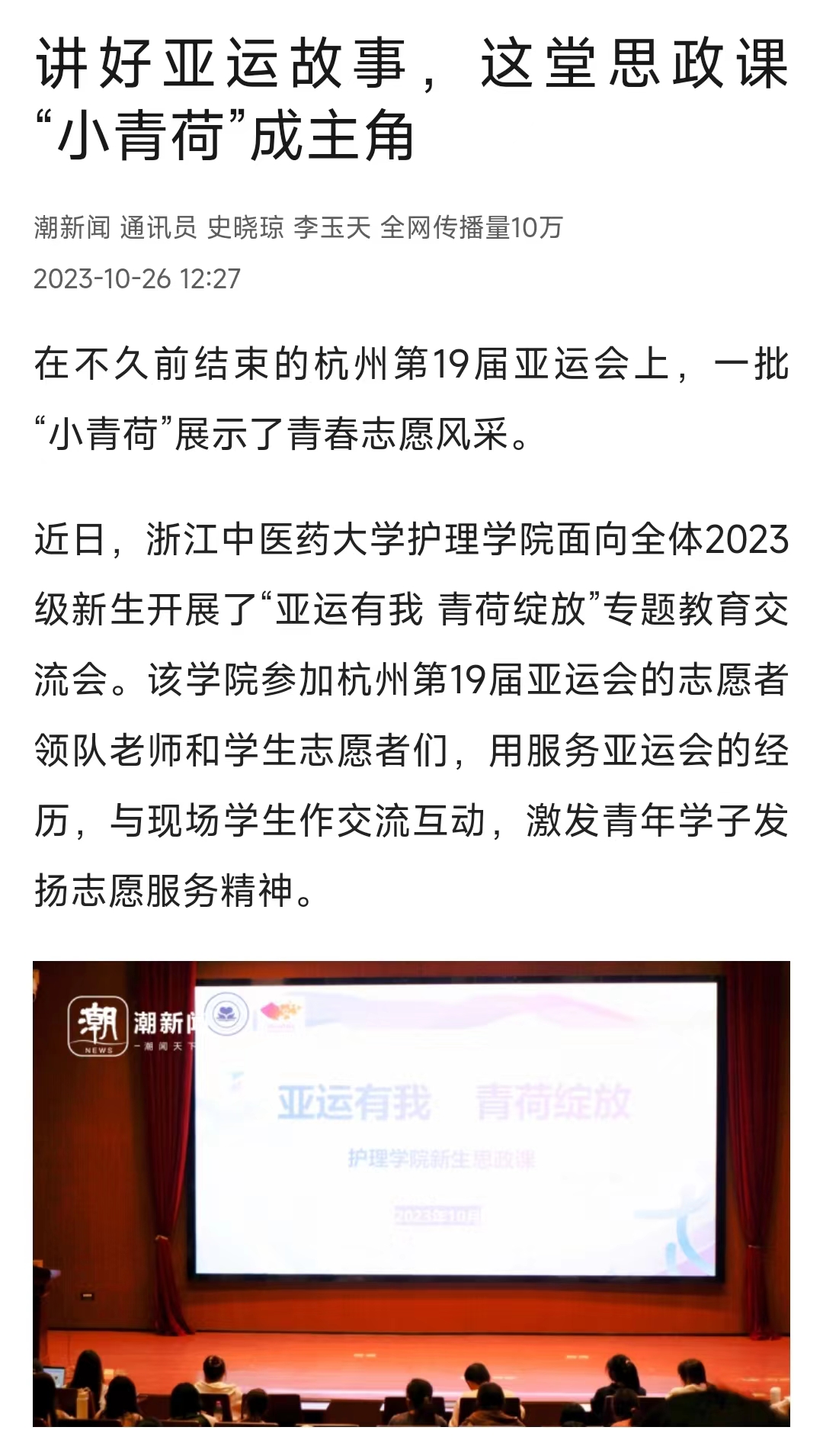 近日,今年会面向全体2023级新生开展了“亚运有我 青荷绽放”专题教育交流会。该学院参加杭州第19届亚运会的志愿者领队老师和学生志愿者们,用服务亚运会的经历,与现场学生交流互动,激发青年学子发扬志愿服务精神。